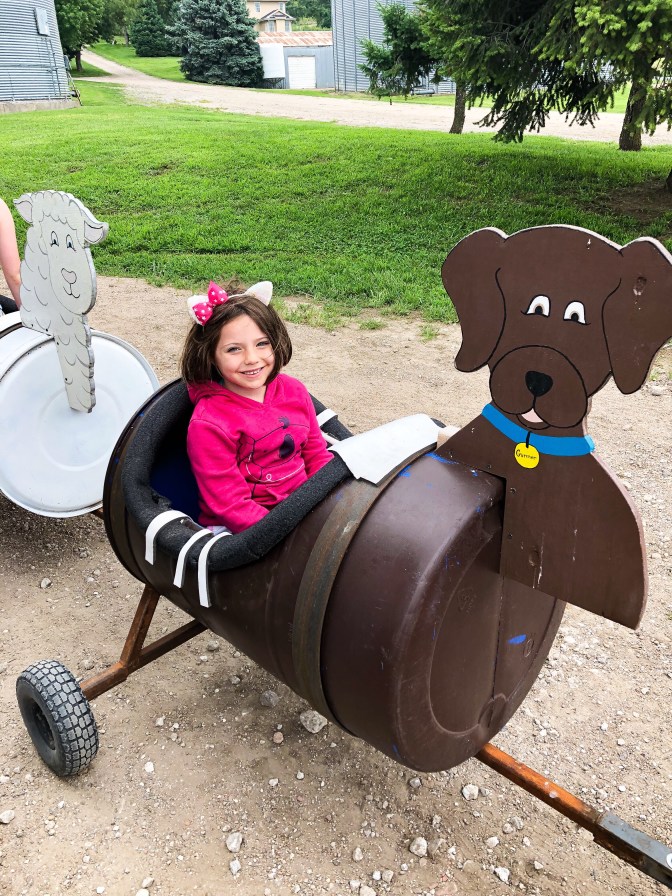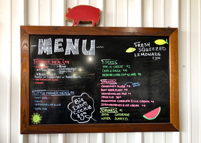 I was also shocked at the food operation! They offer farm fresh meals at an affordable price. We bought the “little farmer meal” for Annabelle: A (very large) hotdog, chips, watermelon slice and Capri Sun for $5. A BLT meal- thick, cut bacon on a croissant, pasta salad, watermelon slice, and can of pop for $9… and a grass-fed cheeseburger meal-same sides, same price. There were lots of other options. Next time, I want to try the Mexican corn dip.